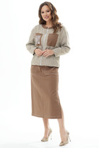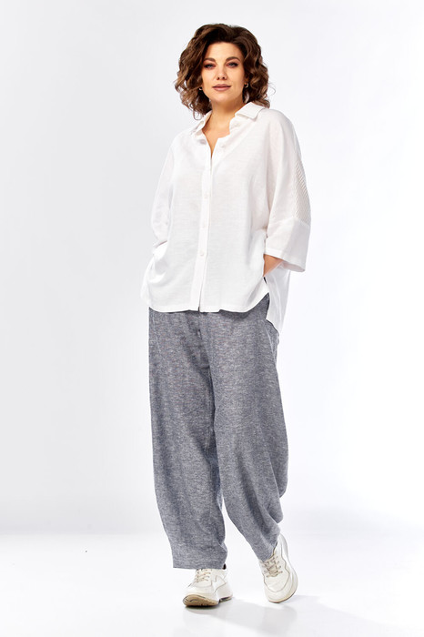 Комплект брючный состоит из рубашки и брюк. Рубашка со спущенным плечом, с застежкой на петли и пуговицы. По спинке кокетка, по шву притачивания нижней части заложена складка, по боковым швам-разрезы. Рукав втачной одношовный короткий. Воротник стояче-отложной с отрезной стойкой. Используются две ткани. Брюки расширенные к низу. На задней половинке-кокетка, обработаны карманы в шве с застежкой на петлю-пуговицу. По переду в рельефном шве бочка обработаны карманы. Застежка на тесьму-молнию, петлю-пуговицу. Верхний срез обработан поясом с резинкой. По поясу-шлёвки. В качестве отделки используется фурнитура, отделочная строчка.