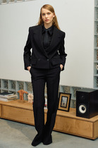 Комплект женский состоит из жакета и брюк. Жакет свободного кроя с застежкой на 2 петли и пуговицы. Перед с боковыми карманами "с листочкой". Рукав втачной, 2-шовный со спущенной линией плеча, спинка по низу частично на резинке. Воротник отложной с лацканами. Жакет без подкладки.Брюки широкие. Передние половинки брюк со складками внахлест, с боковыми карманами. Застежка спереди на молнию, передние половинки брюк с вытачками. Пояс по спинке на резинке.