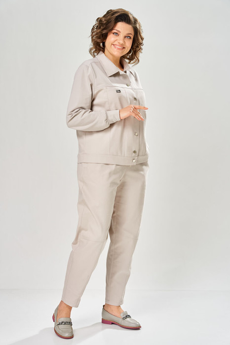 Комплект брючный состоит из жакета и брюк. Жакет полуприлегающего силуэта с центральной застежкой на петли и пуговицы. По переду кокетка, рельефные швы до низа, отрезной пояс по низу. Рукав втачной , одношовный полной длины с манжетом. Воротник стояче-отложной. Брюки зауженные к низу, застрочены вытачки, на передних половинках на уровне колена застрочены вытачки, в боковых швах обработаны карманы с листочкой, на задней половинке накладные карманы.Пояс с резинкой и шнурком.