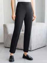 Костюм женский, состоящий из жакета и брюк. Брюки – палаццо, прямые расширенные к низу, на притачном поясе со шлевками и застежкой на одну пуговицу. Задняя половинка брюк с талиевыми вытачками. Передняя половинка брюк с двумя фиксированными складками, боковыми карманами и застежкой на тесьм-молнию с гульфиком и откоском