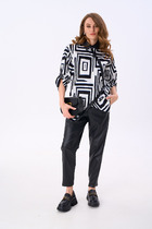Жакет полуприлегающего силуэта, длинной ниже линии бедер.  Спинка с таллиевыми вытачками и средним швом.  Перед с нагрудными вытачками, переведенными в линии плечевого шва и накладными карманами. Жакет с центрально-бортовой застежкой на одну петлю-пуговицу и воротником пиджачного типа.
