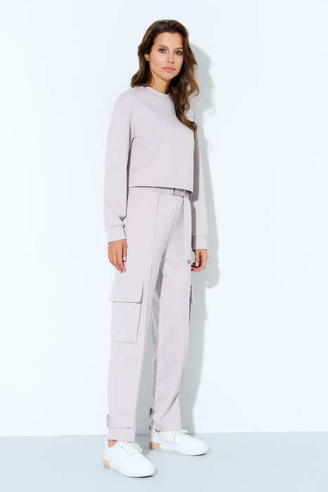 Костюм женский в спортивном стиле из трикотажного полотна. Джемпер укороченный.Рукав одношовный на манжете. Горловина обработана бейкой. Низ джемпера подшит на плоскошовной машине с эластичной тесьмой внутри. По передним половинкам застрочен защип, имитирующий кант. На боковых швах в области колена настрочены накладные карманы "портфель" и закрыты клапаном. По низу брюк из защипа выходит пата, и через шлевку, настроченную на задней половинке застегивается на кнопку .Пояс стачной с эластичной тесьмой внутри. В шов стачивания пояса вставлены полупояса, которые застегиваются на пряжку.