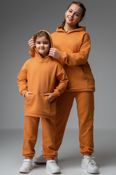 Толстовка с капюшоном регулируется шнурком, добавляя ощущение уюта в прохладные дни, а карман кенгуру придаёт образу практичность. Брюки джоггеры на манжетах, в поясе эластичная резинка и утягивающий шнурок.