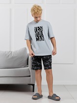 Костюм для мальчика, состоящий из футболки и брюк. Футболка однотонная с принтом на груди; модель свободная, со спущенной линией плеч, овальным вырезом горловины. Брюки из полотна с набивным рисунком эксклюзивного дизайна, прямые, с боковыми карманами с обтачными входами, на притачном поясе с отстроченной эластичной тесьмой.