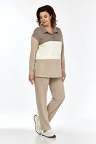 Ультрамодный  костюм  из хлопкового джинса с двойными отстрочками. Жакет  укороченный, свободного силуэта с накладными карманами. Рукав втачной, расширенный к низу   с декоративной локтевой накладкой и хлястиком с пробивными  пуговицами. Воротник отложной,  с маленьуим лацканом,  застежка на  петли  и прбивные  пуговицы. Брюки свободного  силуэта на поясе  с эластичной лентой и шлевками. Брюки высокой посадки, расширенные от бедра, с  четырмя накладными карманами, застежка- молния спереди.