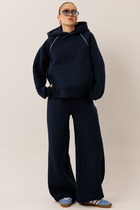 Современный молодёжный костюм, состоящий из свитшота и брюк, зауженных к низу. Брюки на кокетке с боковыми внутренними карманами. Манжеты, горловина, пояс на свитшоте изготовлены из качественной ткани-кашкорсе, которая не растягивается после стирки. Тёмный цвет костюма визуально стройнит.