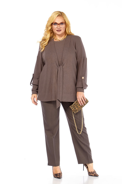 Женственный комплект способен создать уютный образ, стильная вещь, которая отлично подходит для создания комфорта. Состоит из трех изделий лонгслив, джемпер (выполнен из мягкого трикотажа) и брюки. Вырез горловины V-образной формы, дополнен завязками, что является акцентом данного образа. Рукав втачной, со спущенной линией плеча, низ на манжете с застежкой на пату. В боковых швах предусмотрены разрезы. Джемпер идеально подойдет для демисезонного периода, а также для прохладных вечеров. Брюки слегка зауженные к низу. Пояс притачной, частично на резинке. Застежка спереди на тесьму-молнию, петлю-пуговицу