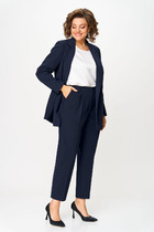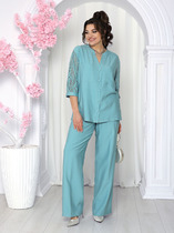 Комплект женский, состоящий из рубашки и юбки. Рубашка с длинным цельнокроеным рукавом, заканчивающимся притачной манжетой (на застежку пуговицу). Воротник стояче-отложной. Перед рубашки с застежкой на планку, петли и пуговицы. Перед с накладными карманами. В боковых швах разрезы. Юбка прямого силуэта, длинная, состоящая из двух видов ткани. Выполнена, как имитация двойной юбки. Верх юбки на обтачке, застежка - молния в среднем шве спинки. Нижняя юбка с высокими боковыми разрезами.