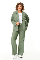 Комплект женский, состоящий из платья и кардигана. Платье А-образного силуэта, на подкладке. По переду средний шов, переходящий в волан с разрезом. По спинке средний шов с окантованным разрезом, со шнурками. В боковых швах карманы и окантованные разрезы со шнурками. Воротник по спинке - цельнокроеная стойка, переходящая в V-образный вырез по переду. Низ изделия разноуровневый, фигурный. Кардиган А-образного силуэта. Выполнен из сетки. Рукав втачной, длинный, расширенный. В комплекте украшение - брошь.