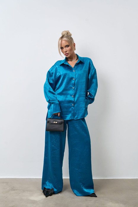 Рубашка свободного кроя и широкие брюки создают ощущение лёгкости и комфорта, при этом силуэт остаётся элегантным.