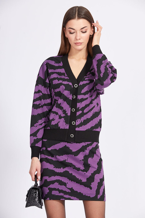 Комплект: кардиган + юбка. Комплект выполнен из трикотажного полотна с геометричным принтом. Кардиган О-образного силуэта, длиной выше линии бедер. Застежка спереди центральная бортовая на пуговицы. Спинка цельная. Горловина спинки и борт выполнен из довяза. Плечевой шов спущен. Рукав рубашечного покроя, одношовный. Низ рукава и низ кардигана выполнены из довяза. Юбка прямого силуэта, на притачном поясе, длиной выше линии колена. Застежка в левом боковом шве на потайную молнию и пуговицу.