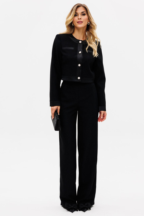 Комплект: жакет + брюки. Комплект выполнен из костюмной ткани с блеском. Жакет прямого силуэта,  до линии талии. Спереди рельефные декоративные карманы, застежка на пуговицы. На спинке средний шов. Горловина округлой формы. Край борта и низ жакета обработаны планкой из отделочной ткани. Рукав втачной, двухшовный. Жакет на притачной по низу подкладке. Брюки прямого силуэта, длиной до пола, без пояса. По боковым швам лампасы из атласа. Сзади в среднем шве застежка на потайную молнию.