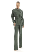 Костюм женский 2х предметный состоит из жакета и брюк. Жакет прилегающего кроя, по полочке жакета расположены прорезные карманы с клапанами. Горловина - отложной воротник с лацканами. Рукав втачной длинный. Застежка петля-пуговица. Брюки прямого кроя с высокой посадкой, на притачном поясе со вставками эластичной тесьмы. в боковых швах брюк -палаццо имеются карманы. Застежка молния на гульфике, петля-пуговица. Жакет без подкладки.