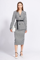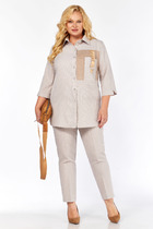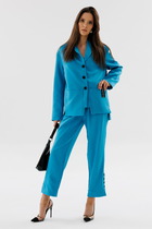 Костюм женский выполнен из хлопковой ткани, состоит из блузы и брюк. Блуза ассиметричного кроя, с полами разной длины. Горловина воротник-стойка. Рукав - кимоно с широкой подгибкой по низу. по переду изделия расположена планка с застежкой (петля-пуговица)- и нанесен принт, спинка изделия разрезная с застежкой петля-пуговица. Брюки на притачном поясе с резинкой, в боковых швах по низу изделия расположена функциональная кулиса позволяющая регулировать (присборивать)длину брюк по боковому шву.
