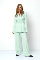Костюм женский 2х предметный состоит из топа и брюк, выполнен из сочетания легкой струящейся ткани и сетки. Топ свободного кроя, ассиметричный , по полочке расположены нагрудные выточки, брюки на притачном поясе с резинкой, по передним полотнищам брюк расположены вставки из полупрозрачной сетки.