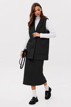Костюм 3-х предметный, состоит их рубашки, юбки, галстука. Выполнен из костюмной ткани. Рубашка прямого кроя без подкладки,  по полочке  расположены накладные декоративные элементы и карманы с клапаном. спинка с отрезной кокеткой и таллиевыми выточками. Воротник отложной на стойке, рукав втачной 7/8. Юбка изделия на притачном поясе с резинкой, застежка потайная молния, по низу юбки расположена шлица, юбка с подкладкой.