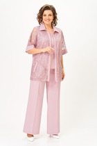 Костюм женский 3х предметный состоит тз брюк блузы и жилета, блуза выполнена из хлопковой ткани, полуприлегающего кроя , горловина воротник на стойке, рукав втачной с высокой манжетой по низу рукава, застежка - планка с петлей пуговицей, низ фигурный. Жилет свободного кроя, укороченный, воротник отложной с лацканами, по переду жилета съёмный пояс, с застежкой петли -пуговицы. Брюки средней посадки, прямого кроя на притачном поясе с резинкой, в боковых швах имеются карманы, застежка петля- пуговица и молния на гульфике
