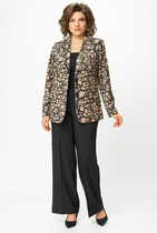 Костюм женский 2х предметный состоит из жакета и брюк, жакет выполнен из сочетания тканей: лен с напылением лаке и текстильное полотно. Жакет приталенный с ассиметричным V-вырезом горловины и лацканами. По полочке жакета расположены прорезные карманы- рамки. Рукав втачной длинный. Низ жакета фигурный, застежка- молния.Жакет на полной подкладке. Брюки классические прямые от бедра, на притачном поясе с резинкой, в боковых швах брюк расположены карманы с отрезным бочком, застежка- молния на гульфике.