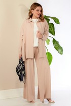 Комплект женский выполнен в спортивном стиле состоит из кофты и брюк. Джемпер ( кофта) свободного кроя oversize выполнен из сочетания болони и трикотажного полотна. Джемпер с фигурным подрезом по низу и карманом с листочкой, горловина неприлегающая стойка, со смещенной планкой и застежкой на кнопки. рукав приспущенный длинный с манжетой по низу, джемпер на полной подкладке. Брюки широкие карго выполнены из болони, изделие на притачном поясе с резинкой, по бокам брюк расположены объемные накладные карманы. застежка молния на гульфике. низ брюк с кулисой- собирается на резинку. Брюки на полной подкладке.