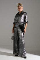 Костюм женский двойка из джинса, состоит из джинсовой рубашки и брюк( джинсы). Рубашка свободного кроя, на полочке расположена кокетка и накладные карманы с клапанами декорированные бахромой, воротник отложной на стойке, рукав втачной длинный низ рукава с манжетой, спинка с отрезной кокеткой. застежка- петля-пуговица на планках по переду. Брюки - клеш слегка расширенные к низу на притачном поясе, в боковых швах расположены карманы, на задних полотнищах брюк накладные фигурные карманы и кокетка. Застёжка молния на гульфике и петля-пуговица.