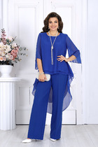 Костюм женский юбочный выполнен из джинсовой ткани, состоит из блузона и юбки карандаш в длине миди. Блузон прямого кроя с отрезной кокеткой по переду декорированной бахромой, горловина- лодочка, рукав втачной длинный. Спинка изделия с глубоким V-образным вырезом и имитацией застежки. Юбка зауженная к низу карандаш, в длине миди, имеет ассиметричные декоративные подрезы по передним и задним полотнищам. Юбка на притачном поясе и с застёжкой молния на гульфике, в боковых швах имеются карманы.