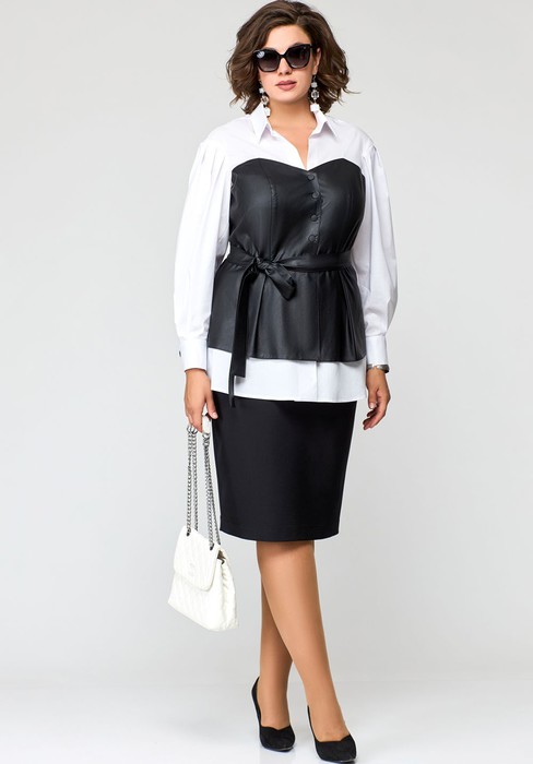 Костюм женский нарядно-повседневный состоящий из блузы и юбки. Блуза прилегающего силуэта выполнена из ткани 2х дизайнов: хлопка и экокожи на хлопковой основе. Вырез горловины V-образный с воротничком, рукав втачной со складками по пройме и притачной манжетой по низу рукава. Застежка на кнопки. По полочке и спинке фигурная притачная деталь из экокожи в виде имитации карсета, по талии отрезная двойная баска (лицо - экокожа, изнанка - хлопок). Декором служит сьемный пояс из экокожи. Юбка прямая на притачном поясе и подкладке зауженная к низу. Пояс частично на резинке, застежка потайная тесьма - молния. Выполнена из костюмно-плательной ткани. По центру юбки обработан разрез.