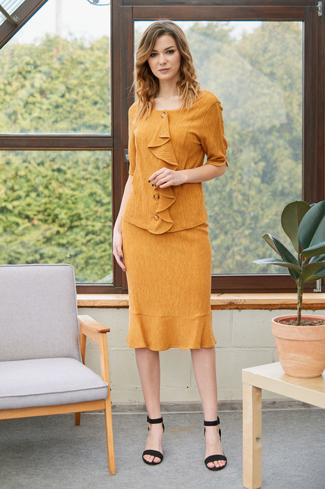Комплект 2-х предметный, состоящий из блузона и юбки. Блуза без воротника с круглым вырезом горловины и центральной застёжкой на пуговицы, декорирована притачным воланом. Рукав и спинка с декоративным разрезом. Юбка прямая с притачным поясом и застежкой по центру спинки на молнию. По низу юбки притачной волан, по среднему шву спинки разрез. Длина блузон по спинке 54 см. Длина рукава 31 см. Длина юбки 70 см.