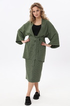 Летний лёгкий костюм состоит из блузы и юбки, выполненный из хлопкового шитья в сочетании с однотонной тканью. Блуза упрямленного силуэта с круглым вырезом горловины и застёжкой на планке по центру спинки.