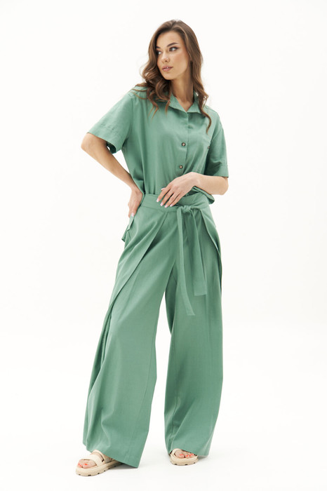 Брючный комплект всегда смотрится эффектно и дорого. Свободная, упрямлённая рубашка и брюки в расслабленном стиле. Покрой - рубашечный, воротник классический рубашечный, застёжка центральная. Спинка с отрезной кокеткой и мягкими складками. Брюки прямого силуэта, на молнии в боковом шве. В передних полотнищах брюк по переду в боковых швах вставлены детали иммитирующие запах, прикрывающие высокий разрез. Брюки с поясом-завязкой  по переду."