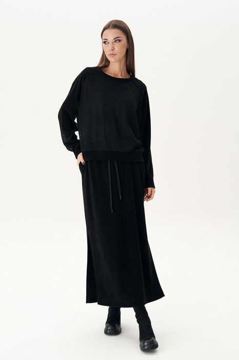 Джемпер свободный, из трикотажной фактурной сетки с металлическим напылением и отделкой из текстурного трикотажа. Покрой свободный с заниженной линией плеча. Рукав с отрезной манжетой и цельнокроеным лампасом, переходящим на полочку и спинку. Манжеты, отрезной пояс низа джемпера и обтачка горловины также из отделочного трикотажа.