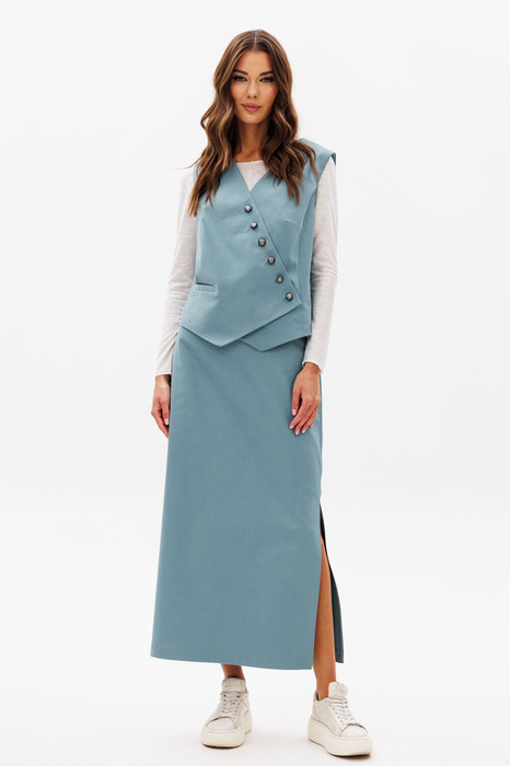 Костюм с жилетом - прекрасное решение для смелых экспериментов. Жилет полуприлегающего силуэта с асимметричной застёжкой, фигурной линией низа и регулирующийся кулисе по спинке. Полочки с отрезным бочком и нагрудными вытачками, спинки - с центральным швом, отрезным бочком и регулирующийся кулисой с фиксаторами.