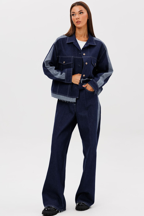 Свободный силуэт, рубашечный покрой, втачной воротник, рукав с притачной манжетой. Полочка с отрезной кокеткой, рельефами и карманом с клапаном. Спинка с отрезной кокеткой и рельефами. Рукав с локтевым швом и разрезом в нём, отделочным лампасом по центру рукава из контрастного денима, мягкой складкой и притачной манжетой. По низу куртки - притачная отделочная полоса в цвет лампаса. Застёжка центральная на петли и пуговицы.