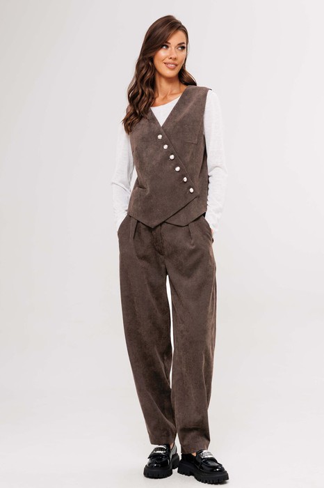 Костюм с жилетом - прекрасное решение для смелых экспериментов. Жилет полуприлегающего силуэта с асимметричной застёжкой, фигурной линией низа и регулирующийся кулисе по спинке. Полочки с отрезным бочком и нагрудными вытачками, спинки - с центральным швом, отрезным бочком и регулирующийся кулисой с фиксаторами. Брюки "баррел" на притачном поясе со шлёвками (эластичном в области спинки), с наклонными карманами , мягкими складками защипами по верху брюк и вытачками по низу. Джемпер трикотажный, с длинным рукавом, полуприлегающего силуэта.