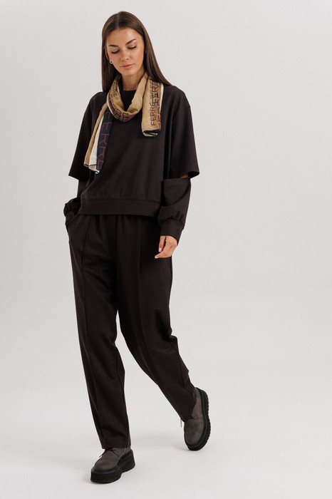 Свободный оверсайз свитшот с заниженной линией плеча, рукавом расширенным в области оката. По низу изделия и рукавов - притачной эластичный манжет. Рукав из 4-х частей с эффектным разрезом в области локтя.