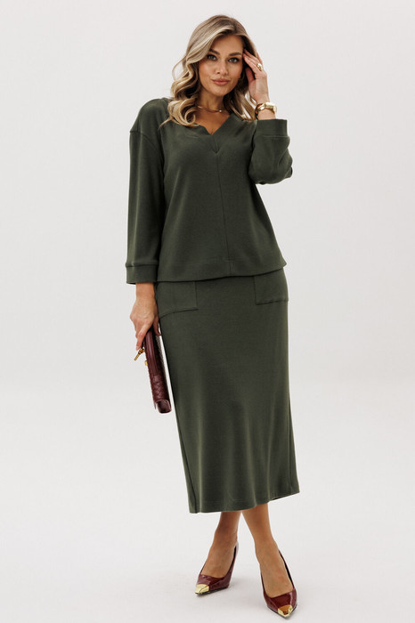 Юбка макси, на притачном эластичном поясе с большими накладными карманами на переднем полотнище. Заднее полотнище с центральным швом, шлицей, талиевыми вытачками и застёжкой.