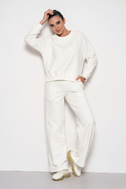 Расслабленные брюки-бананы с мягкой линией кроя обеспечивают комфорт и формируют актуальный силуэт с лёгким акцентом на талии. Хлопчатобумажный топ, декорированный изящным кружевом по нижнему краю, добавляет образу контрастную женственность и завершённость.