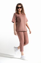 Костюм из гладкокрашеного трикотажного полотна «футер-двунитка», состоящий из джемпера и брюк. Джемпер - прямого силуэта, с длинными втачными рукавами, горловиной овальной формы, обработанной втачной планкой, притачным поясом и принтом на полочке, выполненным методом шелкографии. Манжеты рукавов, планка горловины и полупояса по низу изделия выполнены из эластичного полотна «рибана» в тон основному материалу, боковые швы смещены в сторону переда. Брюки – длинные слегка расширенные книзу, на притачном поясе с эластичной тесьмой внутри и карманами в боковых швах.