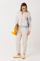 Женский деловой костюм, состоящий из жилета и брюк, выполнен из костюмной ткани высокого качества. Жилет классический двубортный полуприлегающего силуэта на подкладке с функциональными прорезными карманами по переду, воротником пиджачного типа и застежкой на петли и пуговицы. Брюки классические со стрелками полуприлегающего силуэта в области талии и бедер, прямые к низу. Брюки застегиваются на молнию, петлю и пуговицу.
