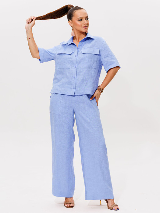 Льняной костюм двойка отличный выбор для женщин которые ценят комфорт и стиль.Этот комплект состоит из рубашки и брюк, идеально подходит для жарких дней. Рубашка прямого силуэта с воротником стойкой и застёжкой на петли и пуговицы. По переду имеются накладные карманы.