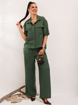 Льняной костюм двойка отличный выбор для женщин которые ценят комфорт и стиль.Этот  комплект состоит из рубашки и брюк, идеально подходит для жарких дней. Рубашка прямого силуэта с воротником стойкой и застёжкой на петли и пуговицы. По переду имеются накладные карманы.