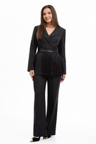 Комплект из джемпера и брюк. Джемпер свободного силуэта из трикотажной ткани с принтом. Рукав втачной одношовный со складками по низу и манжетой. Горловина обработана планкой. По переду поверх принта настрочена сетка с бархатным рисунком. Брюки расширеные книзу с притачным поясом. Спереди застежка гульфик на молнии и петлей и пуговицей по поясу. По задней частям брюк вытачки. Пояс срезинкой в боковых частях. Брюки с заутюженными стрелками. Длина джемпера - 66 см, длина рукава джемпера - 53 см, длина брюк с учетом пояса - 109 см.
