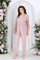 Костюм состоит из жакета и брюк из хлопковой ткани. Жакет полуприлегающего силуэта с воротником пиджачного типа. Застежка однобортная на две пуговицы. Перед с талиевой вытачкой, рельефом и декоративным клапаном. Спинка с рельефами из проймы и средним швом. Рукав втачной двухшовный. Брюки расширеные книзу на притачном поясе. По поясу настрочены шлевки. По передним и задним частям брюк вытачки. На задних частях брюк настрочены карманы. Карманы, вытачки, пояс, низ брюк отделаны отделочной строчкой. Длина жакета - 68см, длина рукава жакета - 60 см, длина брюк с учетом пояса -107 см
