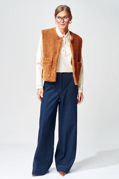 Жилет прямого свободного силуэта из теплой ткани "барашек". Перед с настрочными карманами. Застежка на 3 петли и пуговицы. Жилет на подкладке.   Брюки расширеные книзу на притачном поясе из джинсовой хлопковой  ткани. По поясу настрочены шлевки. По передним и задним частям брюк вытачки. На задних частях брюк настрочены карманы. Карманы, вытачки, пояс, низ брюк отделаны отделочной строчкой. Длина жилета  - 52 см. Длина брюк с учетом пояса - 109 см
