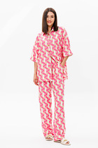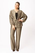 Костюм состоит из джемпера и брюк. Джемпер приталенного силуэта с воротником поло из трикотажного полотна. Рукав втачной одношовный. Брюки палаццо с притачным поясом из мягкой вельветовой ткани. Спереди застежка гульфик на молнии и петлей и пуговицей по поясу. По задней частям брюк вытачки. Пояс с резинкой в боковых частях. Брюки с заутюженными стрелками. Длина брюк с учетом пояса - 109 см. Длина джемпера - 57 см, длина рукава - 60 см.