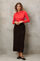 Костюм состоит из джемпера и юбки. Джемпер приталеного силуэта с воротником поло из трикотажного полотна. Рукав втачной одношовный. Длина джемпера - 57 см, длина рукава - 60 см. Юбка прямого силуэта выполненная из мягкой вельветовой ткани. Передняя честь юбки с вытачками, со средним швом и застежкой гульфиком на молнии и щлицей спереди. Задняя часть юбки с вытачками. Юбка на притачном поясе с затежкой на петлю и пуговицу спереди и резинками по бокам. Юбка на подкладке. Длина юбки с учетом пояса - 90 см.