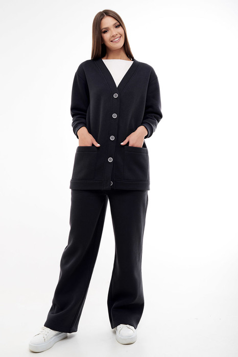 Современный женственный комплект, состоит из кардигана и прямых брюк. Кардиган имеет прямой силуэт и длинные рукава с мажетами (из ткани кошкорсе). Вырез горловины Y-образной формы с притачной планкой. Застежка по центру переда на петли и пуговицы. На переде удобные карманы. По планкам, по карманам, проложена отделочная строчка. Брюки длинные, прямые. По передним половинкам функциональные карманы. Пояс из ткани кошкорсе, с резинкой и шнуром внутри.