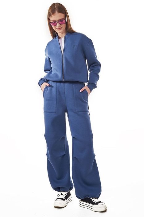Современный комфортный костюм, состоит из брюк карго и укороченного бомбера. Отлично подойдёт для дома, прогулок, путешествий и отдыха. Пошит из теплой, комфортной ткани. Бомбер прямого силуэта, с застежкой молнией из металла. Горловина, манжеты рукавов выполнены из ткани-компаньона кошкорсе. На левом переде вышивка-логотип в цвет ткани. Бомбер с кулисой по низу с резинкой внутри и фиксаторами на боковых швах. Брюки расширенные к низу, с возможностью заузить и зафиксировать ширину внизу (низ имеет кулиску с резинкой и фиксатором). На передних половинках брюк удобные накладные карманы, складки в районе линии колен. Пояс из ткани компаньена кошкорсе со шнуром и резинкой внутри.