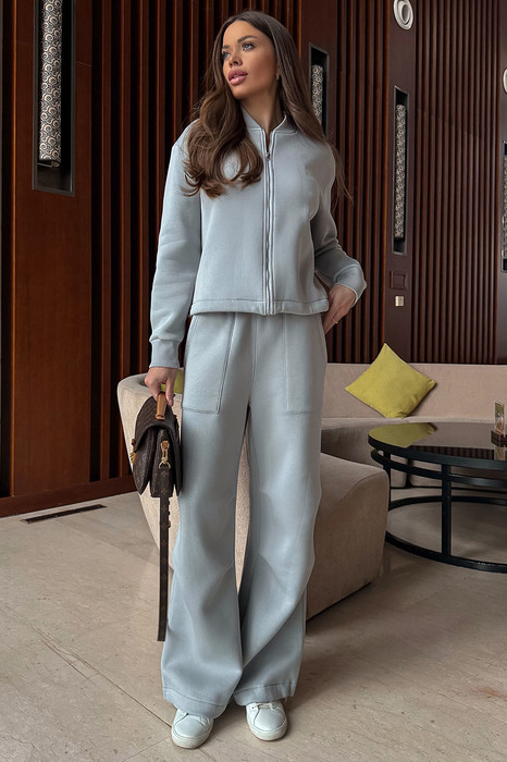 Современный комфортный костюм, состоит из брюк карго и укороченного бомбера. Отлично подойдёт для дома, прогулок, путешествий и отдыха. Пошит из теплой, комфортной ткани. Бомбер прямого силуэта, с застежкой молнией из металла. Горловина, манжеты рукавов выполнены из ткани-компаньона кошкорсе. На левом переде вышивка-логотип в цвет ткани. Бомбер с кулисой по низу с резинкой внутри и фиксаторами на боковых швах. Брюки расширенные к низу, с возможностью заузить и зафиксировать ширину внизу (низ имеет кулиску с резинкой и фиксатором). На передних половинках брюк удобные накладные карманы, складки в районе линии колен. Пояс из ткани компаньена кошкорсе со шнуром и резинкой внутри.