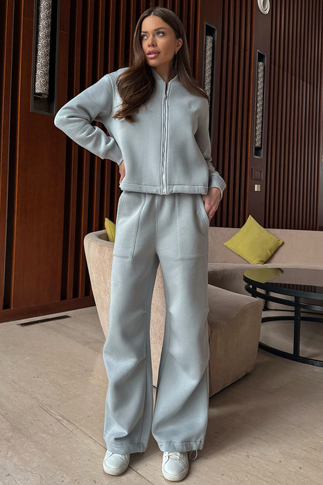 Современный комфортный костюм, состоит из брюк карго и укороченного бомбера. Отлично подойдёт для дома, прогулок, путешествий и отдыха. Пошит из теплой, комфортной ткани. Бомбер прямого силуэта, с застежкой молнией из металла. Горловина, манжеты рукавов выполнены из ткани-компаньона кошкорсе. На левом переде вышивка-логотип в цвет ткани. Бомбер с кулисой по низу с резинкой внутри и фиксаторами на боковых швах. Брюки расширенные к низу, с возможностью заузить и зафиксировать ширину внизу (низ имеет кулиску с резинкой и фиксатором). На передних половинках брюк удобные накладные карманы, складки в районе линии колен. Пояс из ткани компаньена кошкорсе со шнуром и резинкой внутри.