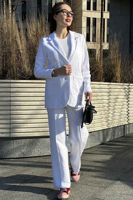 Костюм Gowear из футера в стиле smart casual поможет создать в меру строгий и одновременно расслабленный образ. Костюм состоит из жакета и прямых брюк. Жакет прямого силуэта с воротником и лацканами, имеет удобные карманы и застежку на 2 пуговицы. На левом лацкане вышивка-логотип в контрастном цвете. Низ и борта имеют открытые края (эффект необработанного шва), укреплены дополнительной строчкой. Жакет без подкладки. Брюки прямые. На передних половинках - отделочная строчка по стрелкам и удобные боковые карманы. Пояс из ткани кошкорсе, с резинкой и контрастным шнурком.